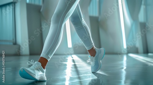 A person walks confidently in stylish white athletic shoes on a modern studio floor