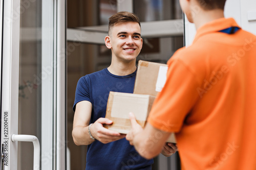A person wearing an orange T-shirt is delivering parcels to a sa