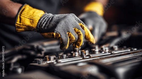 A person wearing gloves is working on an engine, wearing a yellow glove.