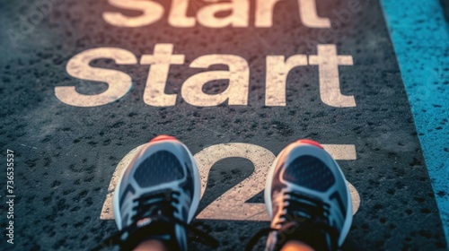 A person wearing sneakers standing on the start line. Generative AI.