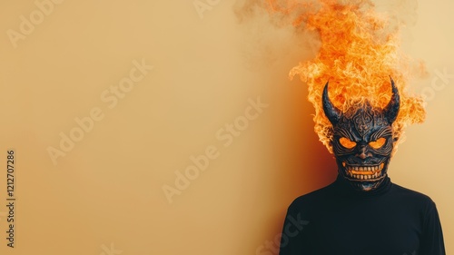 A person wears a dramatic mask with flames erupting from it, set against a plain background, creating a striking and surreal visual effect.
