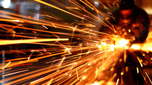A person works in a metal workshop, using a grinding tool that produces an array of bright sparks. The image captures the dynamic energy and intensity of the grinding process.