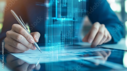 A person writes on a document while digital data visualizations rise above, blending technology with traditional note-taking.