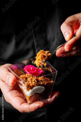 A person's hands holding a modern dessert in a clear plastic cup, with a spoon lifting a bite of the crumbly topping. A small pink flower decorates the dessert. Dark background