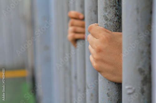A person's hands tightly grasp the vertical, weathered metal bars of a rusty prison door or window, emphasizing feelings of confinement and despair in a stark, dimly lit setting.