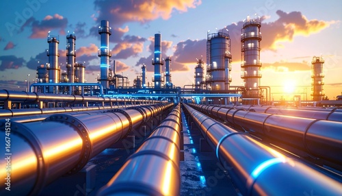 A petrochemical industry or oil refinery at sunset. Large pipes carrying oil and gas dominate the foreground, leading to a magnificent industrial complex with towers