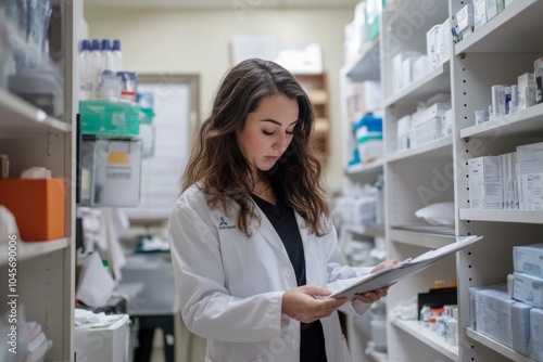 A pharmacist carefully examines medication records while standing in a tidy pharmacy, surrounded by neatly arranged shelves full of various medications and supplies