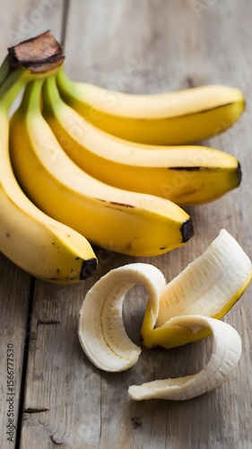 A photo of a bunch of ripe bananas resting on a wooden surface.