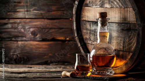 A photo of scotch whiskey. There's a bottle, a glass, and an old wooden barrel. There's some space at the top of the photo for you to add your own text.