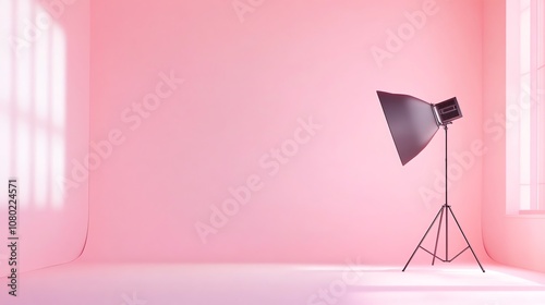 A photo studio with one light and softbox set up against a pink backdrop.