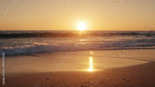 a photograph of the sun is setting over the ocean and the sand is blowing in the foreground