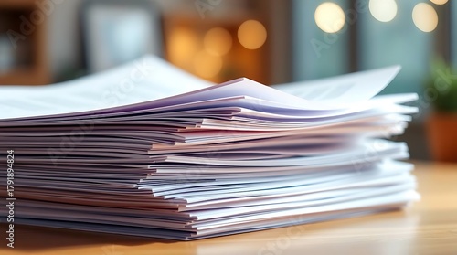 A photorealistic rendering of a stack of financial reports, featuring crisp edges and realistic paper texture, bathed in soft, professional lighting.