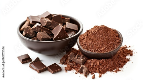 A photostock images of rich cocoa powder in a bowl next to chocolate pieces on a clean white background