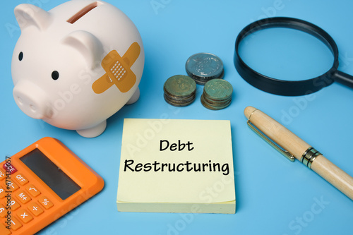 A picture of debt restructuring concept. Word on notepad, piggybank with plaster and other item insight.