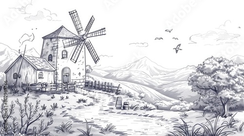 A picturesque drawing of a windmill on a hill. Perfect for travel brochures