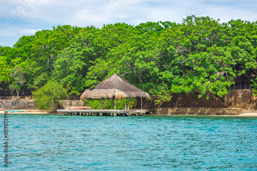A picturesque hut surrounded by lush greenery on the serene waters of Rosario Islands, Cartagena, Colombia.