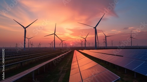 A picturesque landscape featuring solar panels and wind turbines silhouetted against a beautiful sunset
