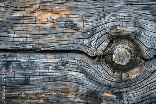 A piece of aged wood showing knots, cracks, and a hole in it, Weathered and aged wood with knots and cracks