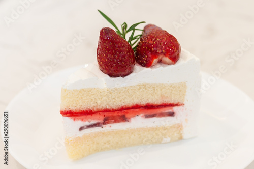 A piece of strawberry cake with cream and strawberry jam layers and topping with two fresh strawberry.
