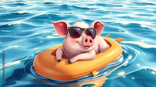 A pig is enjoying a leisurely afternoon, lounging on a yellow pool float in a clear blue pool, wearing stylish sunglasses. The sun shines brightly, creating a fun atmosphere.