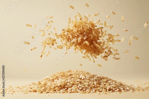 A pile of brown rice falls from above into the air