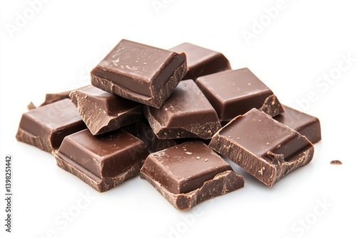 A pile of dark chocolate squares isolated on white background