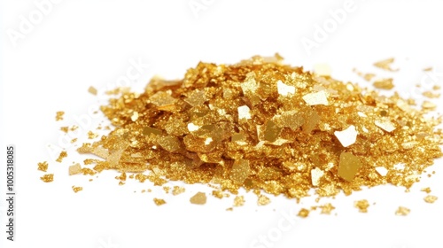 A pile of gold flakes and glitter arranged artistically on a white background.