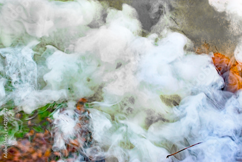 A pile of leaves is being burned in Windsor in Upstate NY. Smoke and flames are coming from in, under, and around the leaves in the burn pile. There is beauty in the smoke patterns.