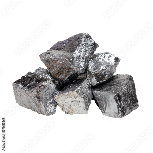 A pile of shiny aluminum ore rocks showcasing their natural, reflective surfaces and solid textures. Ideal for geological study and mineral collection isolated on white background
