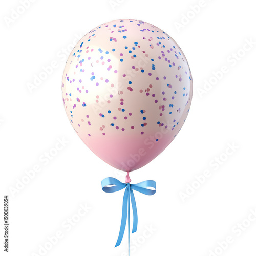 A pink balloon decorated with colorful confetti and tied with a blue ribbon.