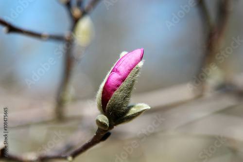 A pink Magnolia bud in Spring season with copy space, selective focus.
