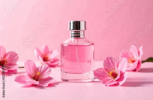 A pink perfume bottle surrounded by pink flowers on pink