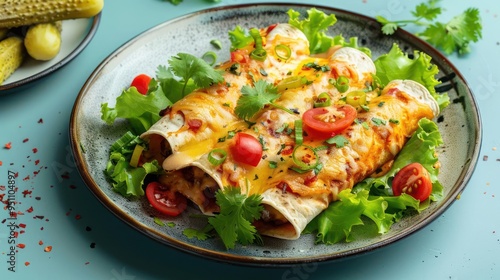 a plate of food on a blue table