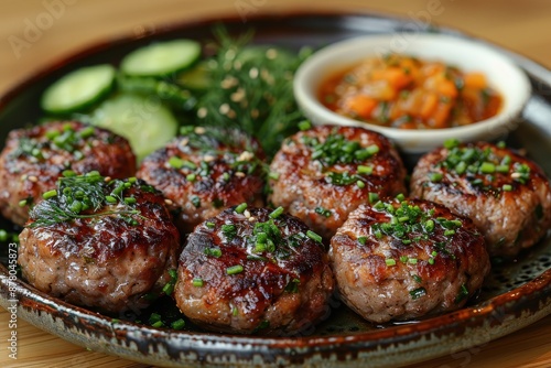 A plate of kotleti, Russian meat patties, served with mashed potatoes and a side of pickled vegetables.