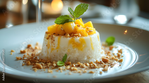 A plate of mango sticky rice with a sprig of mint.