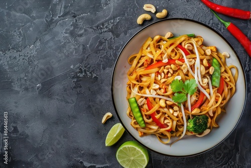 A plate of pad Thai with vibrant vegetables and peanuts, isolated with ample copy space