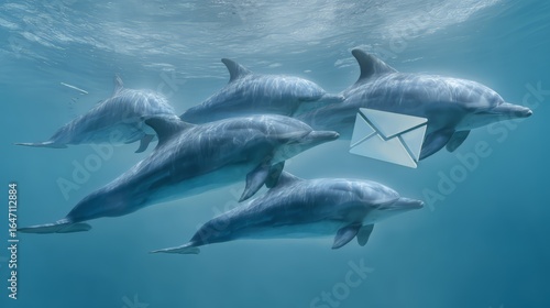 A playful group of dolphins swims underwater with a floating envelope nearby.