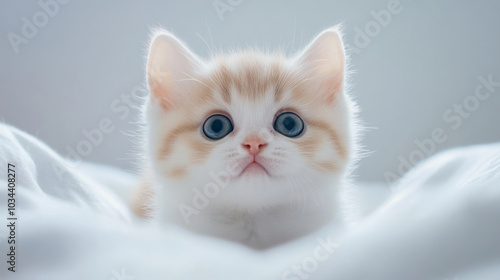 A playful kitten with blue eyes perched on soft white bedding during the afternoon light in a cozy indoor setting