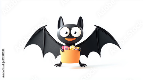 A playful minimalist bat with large round eyes joyously holds a basket full of colorful candies in a cheerful atmosphere