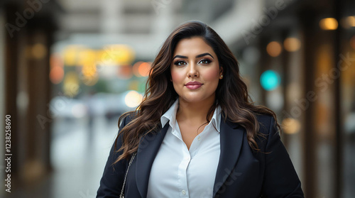 A Plus-Size Hispanic Woman Commuting to Work with Confidence in the Morning. Una Mujer Hispana de Talla Grande Va al Trabajo con Confianza por la Mañana, plus-size woman, Hispanic woman, commuting to