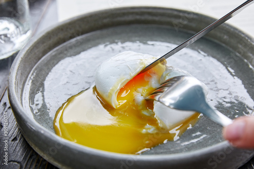 A poached egg is cut with a knife and the yolk flows on a gray plate, breakfast