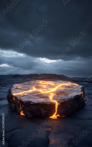 A podium made of obsidian rock, glowing with veins of molten lava in a volcanic landscape.