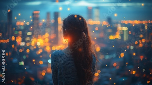 A poetic, blurred image of a girl looking out over a city skyline, the soft glow of the city lights contrasting with the gentle blur of her face and hair.