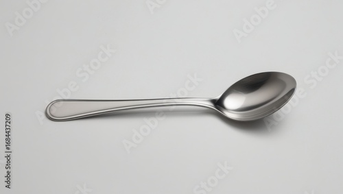 A polished, stainless steel spoon lies flat against a neutral backdrop.