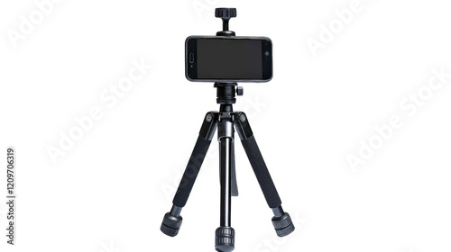 A portable and adjustable tripod with a smartphone mount, displayed against a cleanTransparent background, PNG file . The tripod features adjustable legs and a clip for easy phone attachment.
