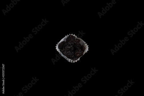 A portion of black raisins in a paper muffin cup on a black background.