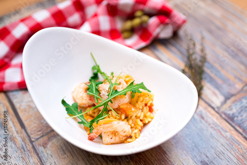 A portion of risotto with shrimp, seafood and arugula in a deep boat plate