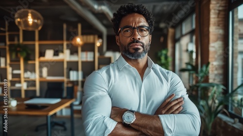A portrait of a confident man in smart attire standing in a contemporary office, showcasing professionalism and the modern working environment.