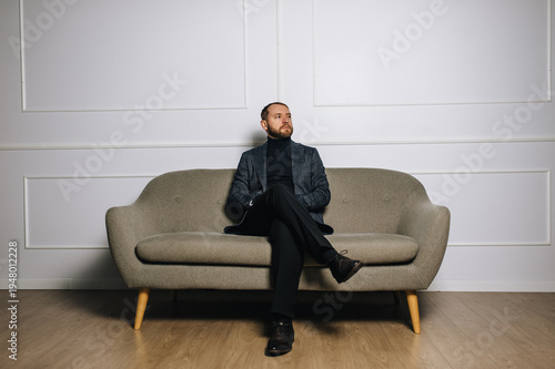 A portrait of a stylish, respectable, bearded businessman in a black suit and tie sitting on a sofa against a white wall in his office. Business and lifestyle concept.