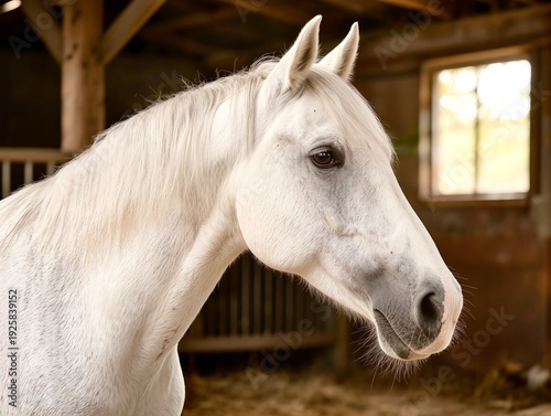 A portrait of a white horse in profile. The horse is housed in a cozy stable with wooden partitions, illuminated by soft natural light from a window. A tranquil and atmospheric rural scene.